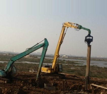 液压振动打桩机主要安装在挖掘机上使用。高频液压振动打桩机内置两只偏心轴,采液压马达驱动,产生高速旋转及垂直激振力,透过减振橡胶块后,维持一定的振幅,能够应付多种类型的土质与打桩要求。激振力是与偏心轴尺寸和振动次数平方成正比,制作的偏心轴均经过详细计算与测试,兼顾的激振力和材料特性的匹配,不但能满足工作需要,同时保证了机械可靠度 。